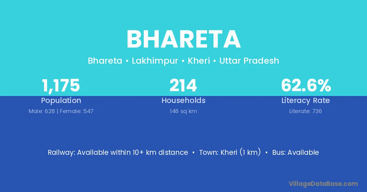 Kheri (1 km) is the nearest town to Bhareta village for major economic activities and is located approximately 1 km away.