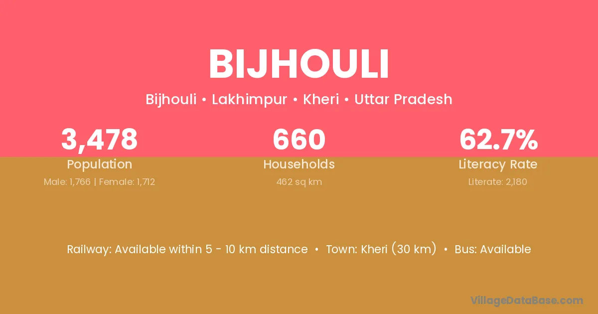 Kheri (30 km) is the nearest town to Bijhouli village for major economic activities and is located approximately 30 km away.
