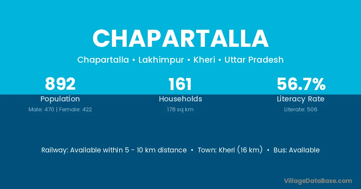 Kheri (16 km) is the nearest town to Chapartalla village for major economic activities and is located approximately 16 km away.
