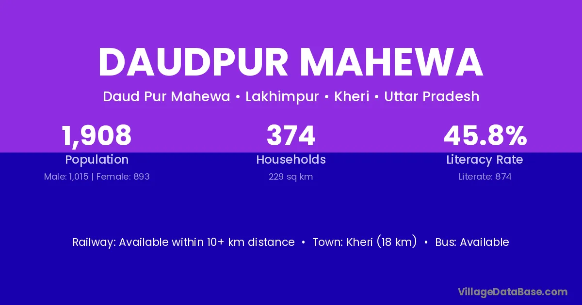 Kheri (18 km) is the nearest town to Daudpur Mahewa village for major economic activities and is located approximately 18 km away.