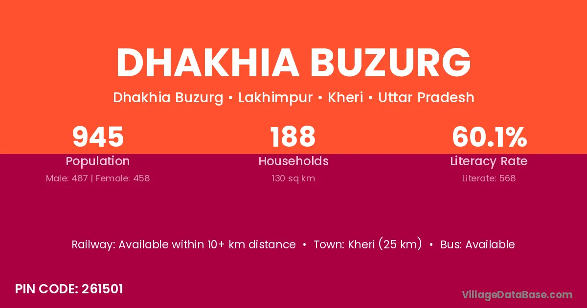 Kheri (25 km) is the nearest town to Dhakhia Buzurg village for major economic activities and is located approximately 25 km away.