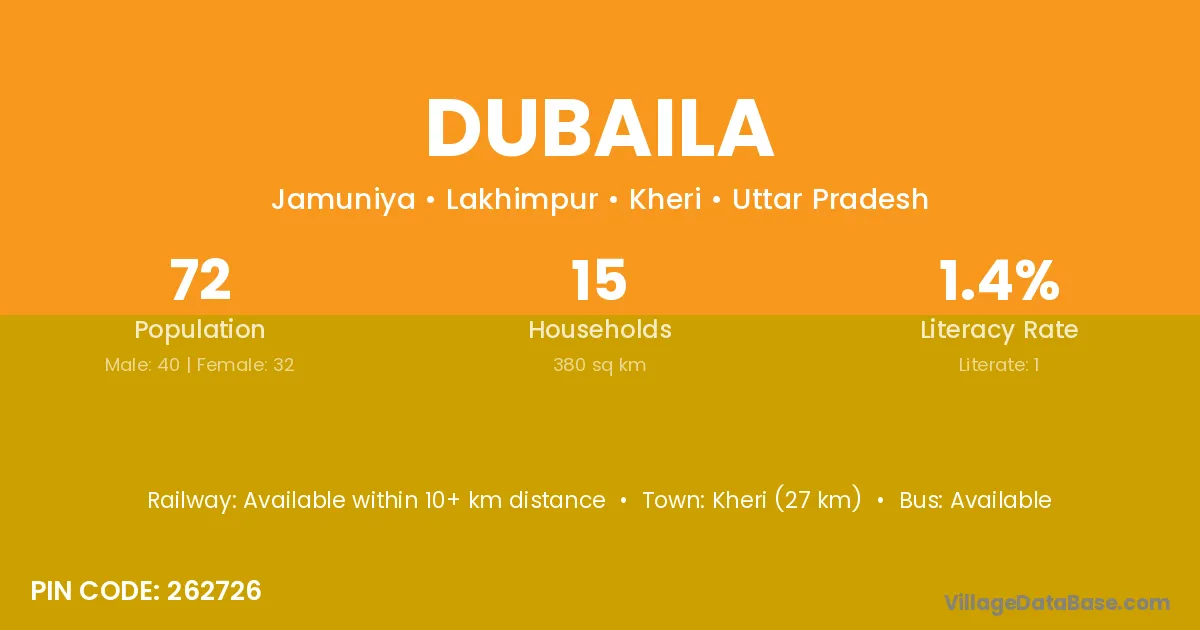 Dubaila village has a total population of 72 people, of which 40 are males and 32 are females.