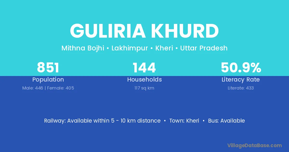 Guliria Khurd village has a total population of 851 people, of which 446 are males and 405 are females.