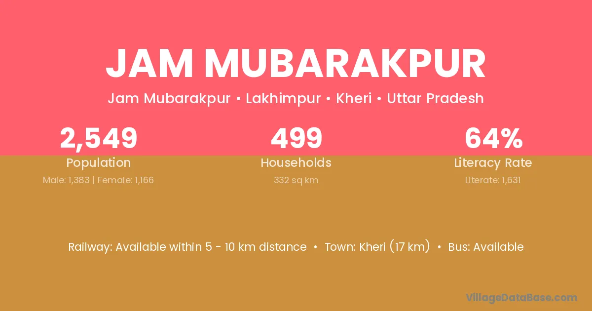 Kheri (17 km) is the nearest town to Jam Mubarakpur village for major economic activities and is located approximately 17 km away.