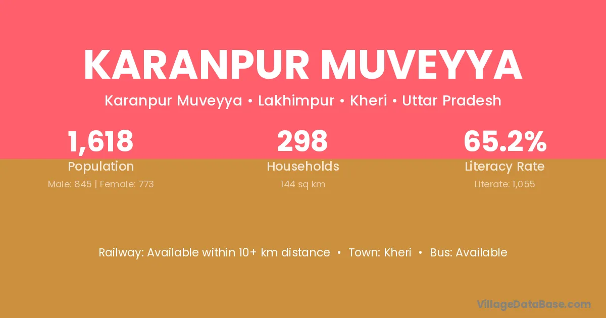 Karanpur Muveyya village has a total population of 1,618 people, of which 845 are males and 773 are females.