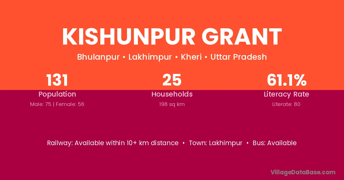Kishunpur Grant village has a total population of 131 people, of which 75 are males and 56 are females.