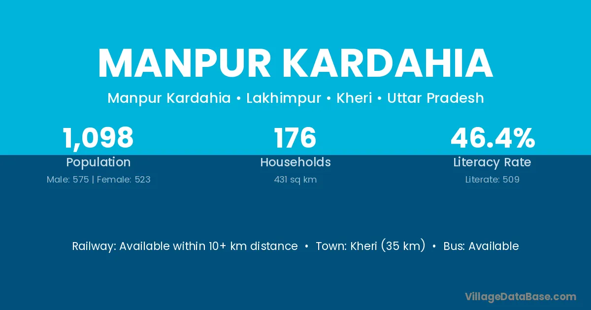 Kheri (35 km) is the nearest town to Manpur Kardahia village for major economic activities and is located approximately 35 km away.
