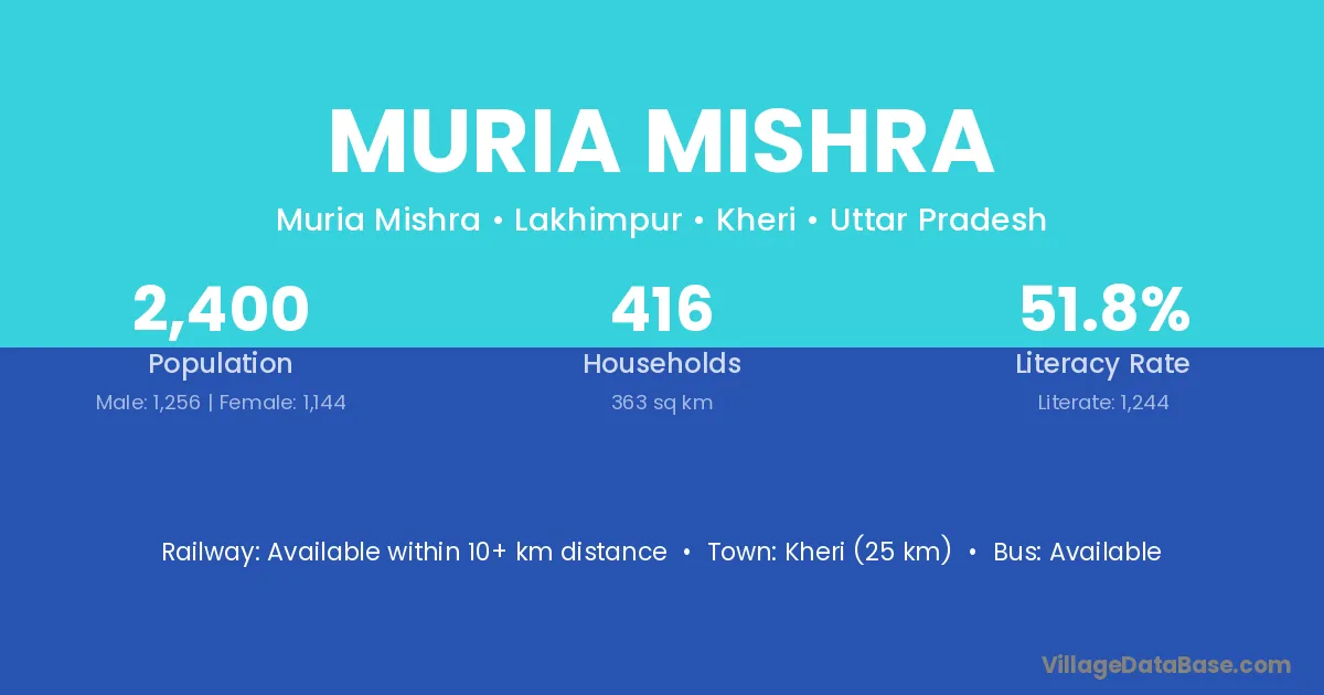 Kheri (25 km) is the nearest town to Muria Mishra village for major economic activities and is located approximately 25 km away.