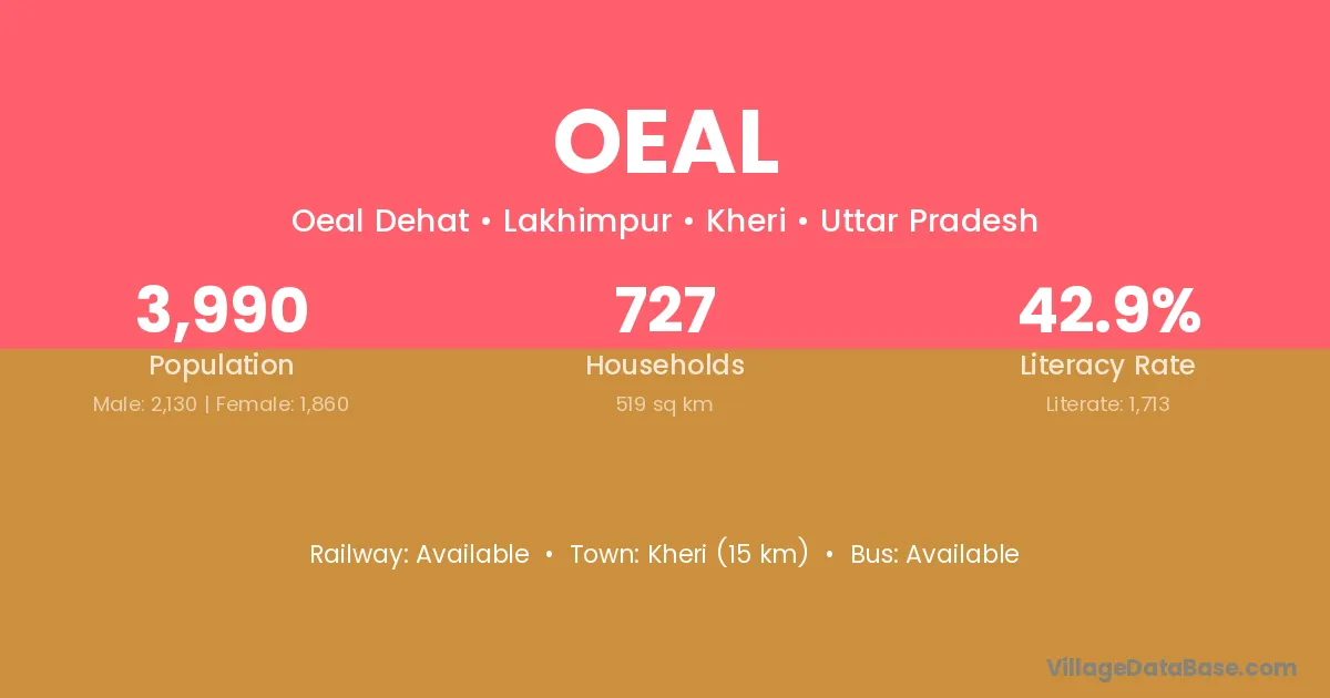 Kheri (15 km) is the nearest town to Oeal village for major economic activities and is located approximately 15 km away.