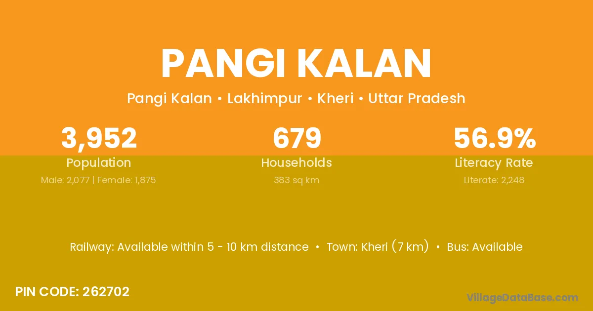 Pangi Kalan village has a total population of 3,952 people, of which 2,077 are males and 1,875 are females.
