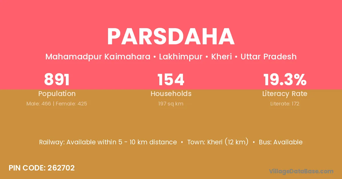 Kheri (12 km) is the nearest town to Parsdaha village for major economic activities and is located approximately 12 km away.