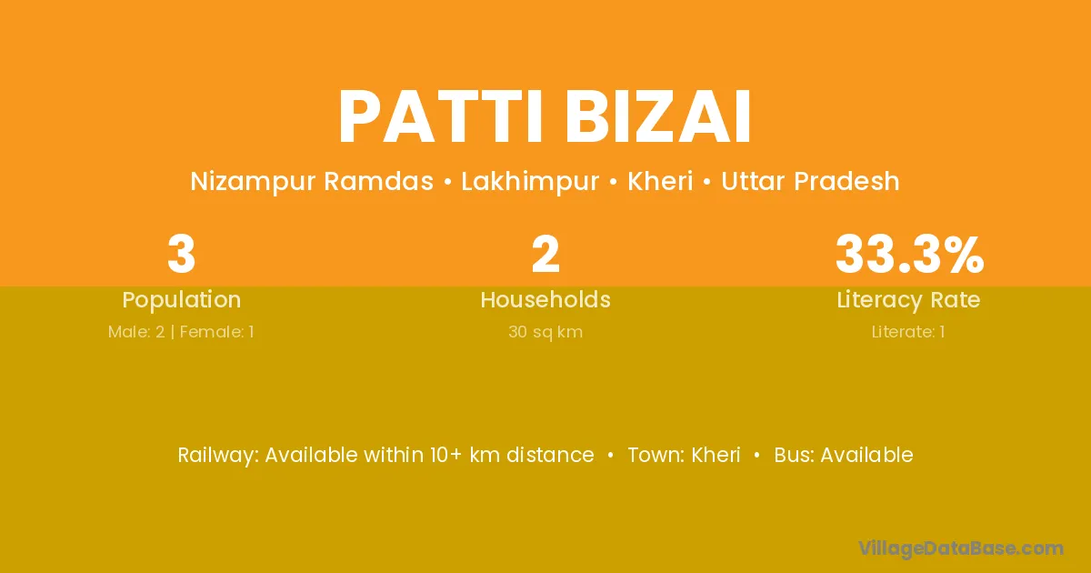 The literacy rate of Patti Bizai village is 33.33%. Male literacy stands at 50.00% and female literacy at 0.00%.