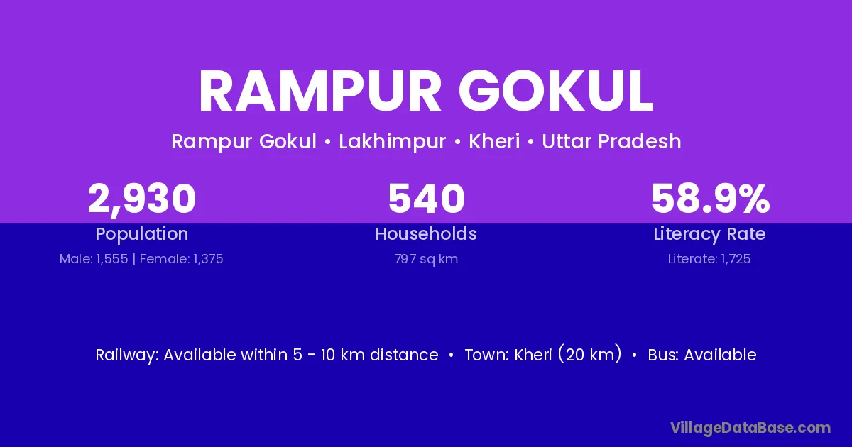 Kheri (20 km) is the nearest town to Rampur Gokul village for major economic activities and is located approximately 20 km away.