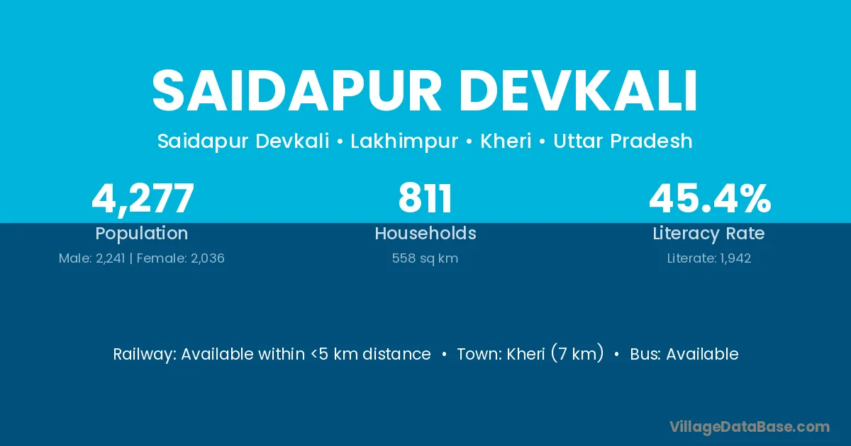 Kheri (7 km) is the nearest town to Saidapur Devkali village for major economic activities and is located approximately 7 km away.