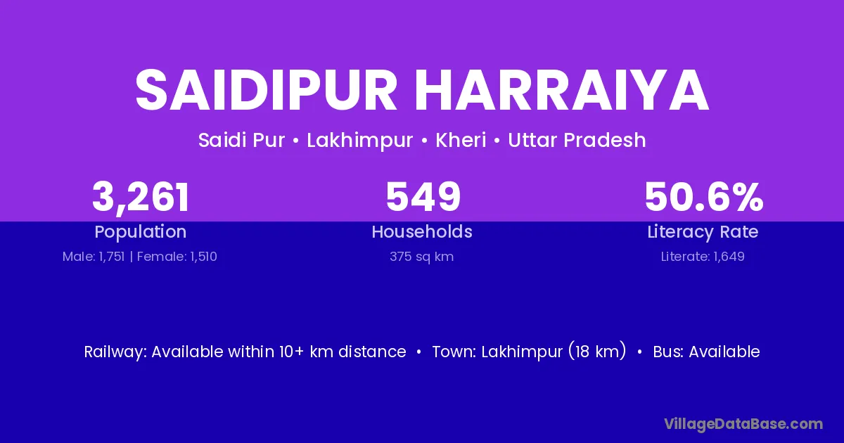 Lakhimpur (18 km) is the nearest town to Saidipur Harraiya village for major economic activities and is located approximately 18 km away.