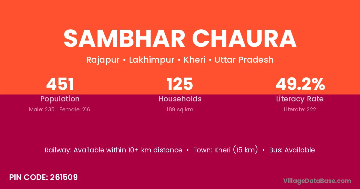 Sambhar Chaura village has a total population of 451 people, of which 235 are males and 216 are females.