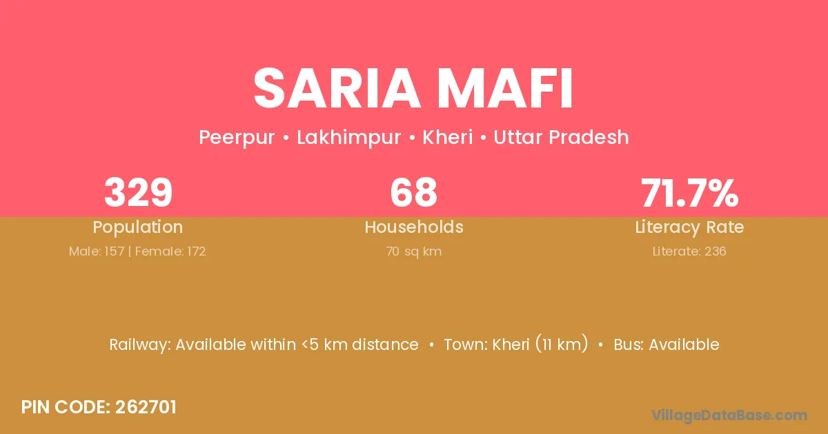 Kheri (11 km) is the nearest town to Saria Mafi village for major economic activities and is located approximately 11 km away.