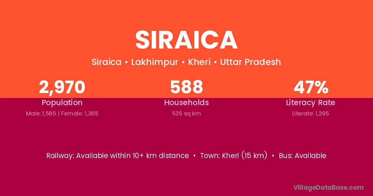 Kheri (15 km) is the nearest town to Siraica village for major economic activities and is located approximately 15 km away.