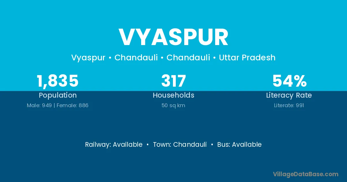 The literacy rate of Vyaspur village is 65.64%. Male literacy stands at 75.42% and female literacy at 55.15%.