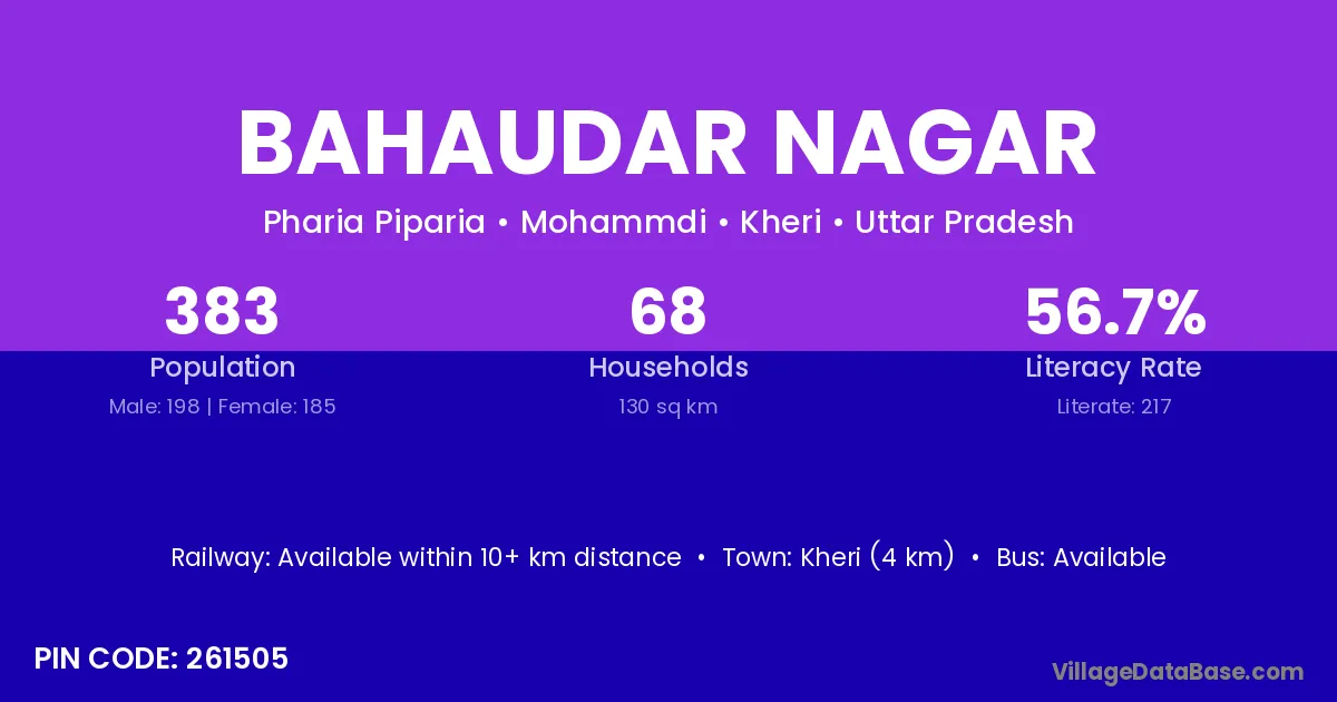 Kheri (4 km) is the nearest town to Bahaudar Nagar village for major economic activities and is located approximately 4 km away.