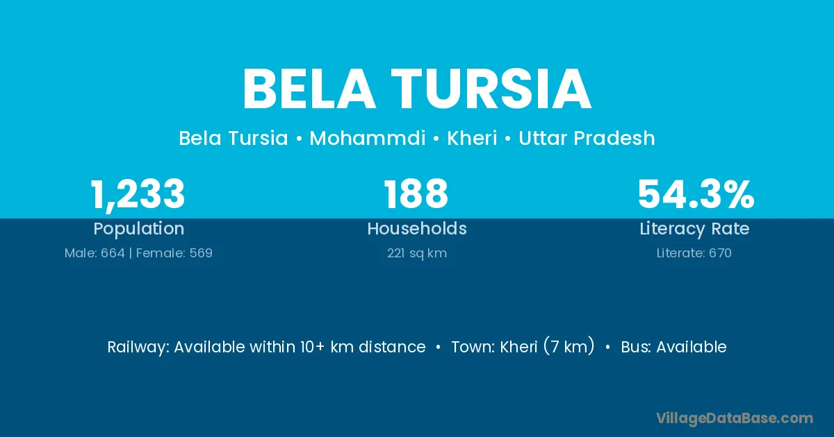Kheri (7 km) is the nearest town to Bela Tursia village for major economic activities and is located approximately 7 km away.