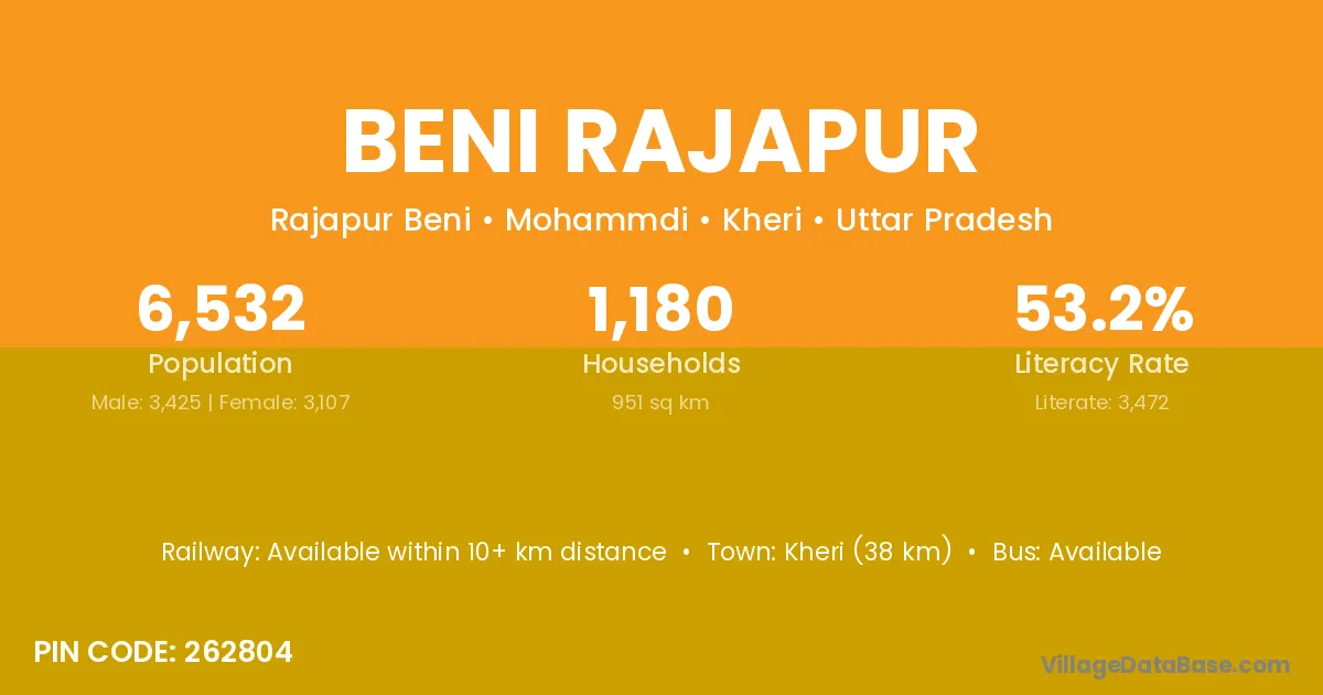 Kheri (38 km) is the nearest town to Beni Rajapur village for major economic activities and is located approximately 38 km away.