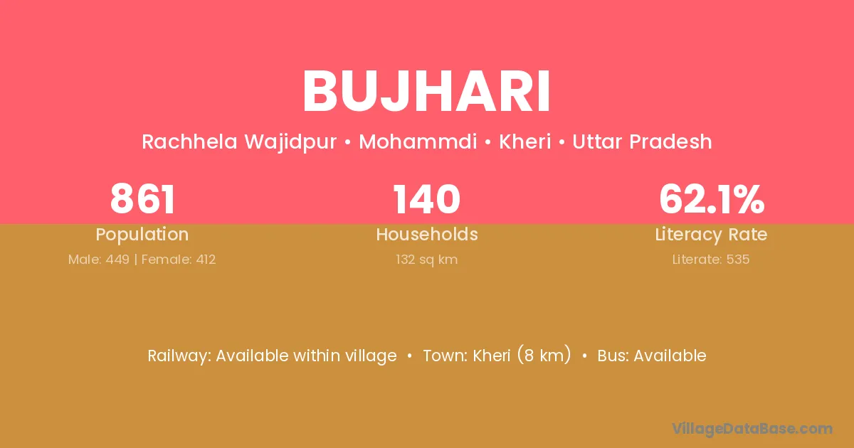Bujhari village has a total population of 861 people, of which 449 are males and 412 are females.