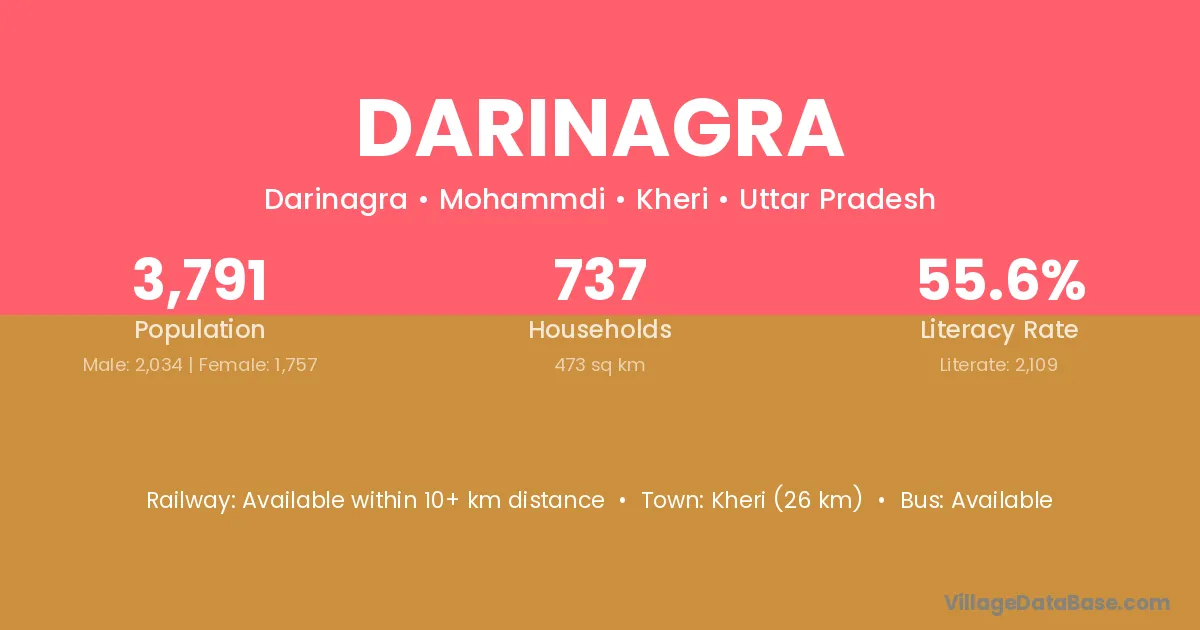 Darinagra village has a total population of 3,791 people, of which 2,034 are males and 1,757 are females.