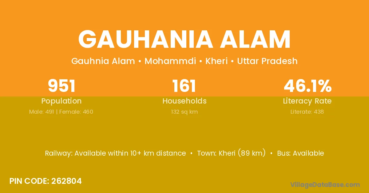 Kheri (89 km) is the nearest town to Gauhania Alam village for major economic activities and is located approximately 89 km away.