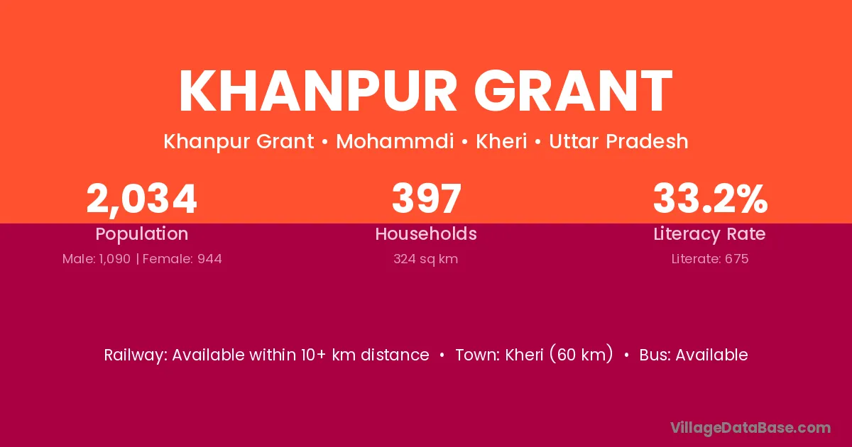 Kheri (60 km) is the nearest town to Khanpur Grant village for major economic activities and is located approximately 60 km away.