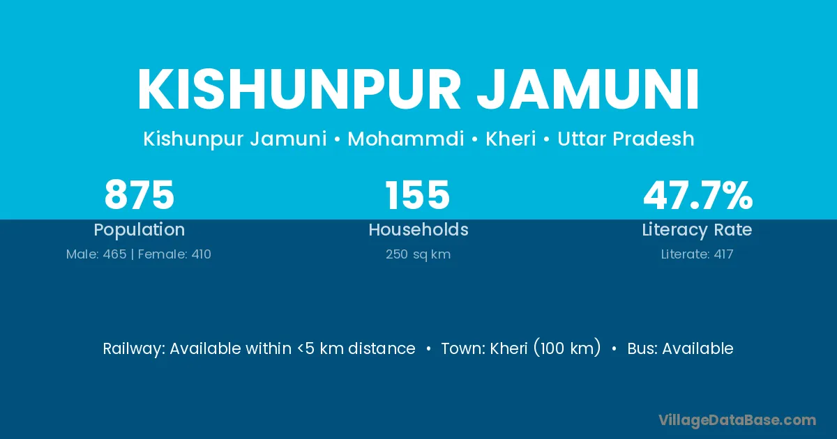 Kheri (100 km) is the nearest town to Kishunpur Jamuni village for major economic activities and is located approximately 100 km away.
