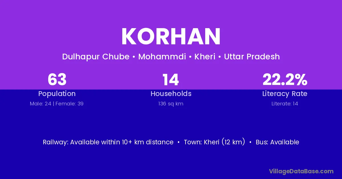 The literacy rate of Korhan village is 22.22%. Male literacy stands at 20.83% and female literacy at 23.08%.