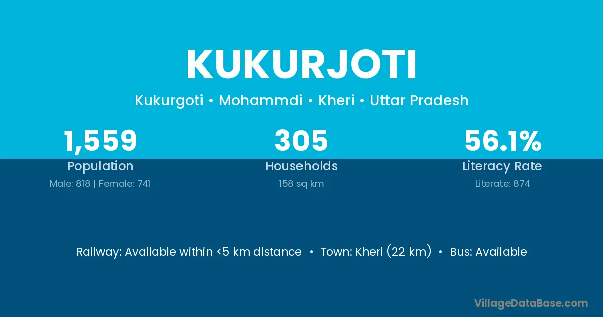 Kheri (22 km) is the nearest town to Kukurjoti village for major economic activities and is located approximately 22 km away.