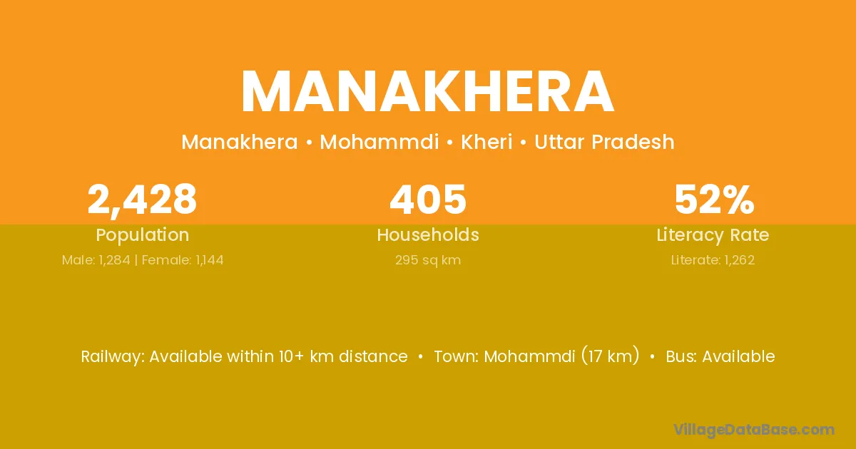 Mohammdi (17 km) is the nearest town to Manakhera village for major economic activities and is located approximately 17 km away.