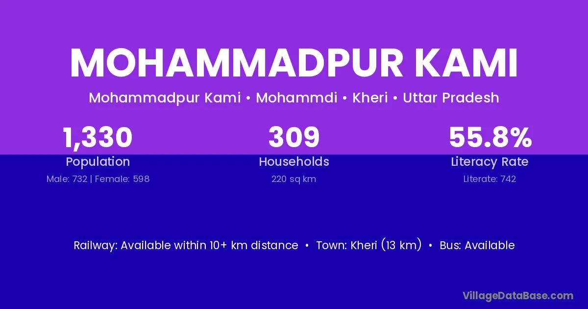 Kheri (13 km) is the nearest town to Mohammadpur Kami village for major economic activities and is located approximately 13 km away.