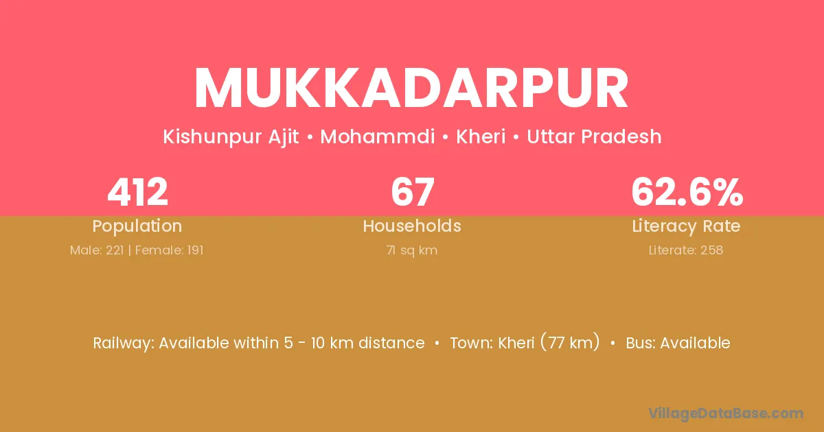 Mukkadarpur village has a total population of 412 people, of which 221 are males and 191 are females.