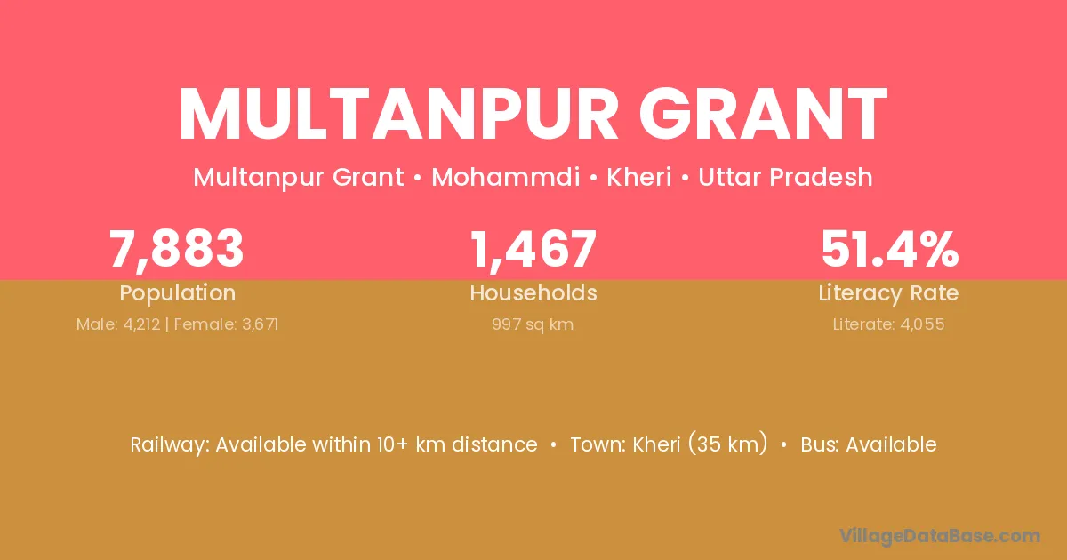 Kheri (35 km) is the nearest town to Multanpur Grant village for major economic activities and is located approximately 35 km away.
