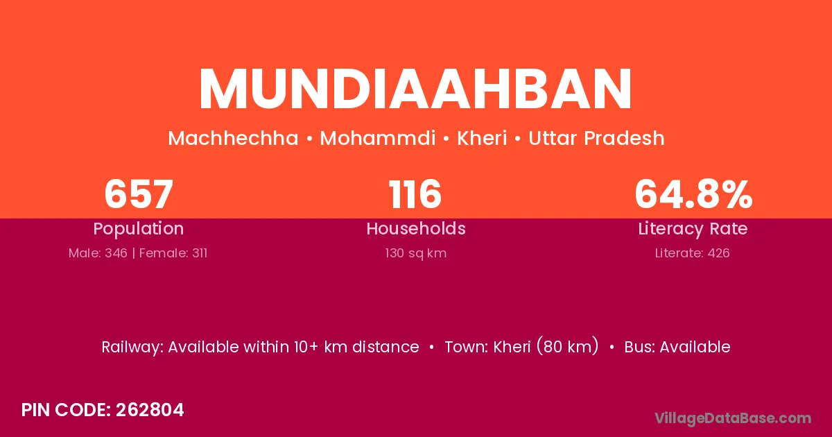 Kheri (80 km) is the nearest town to Mundiaahban village for major economic activities and is located approximately 80 km away.