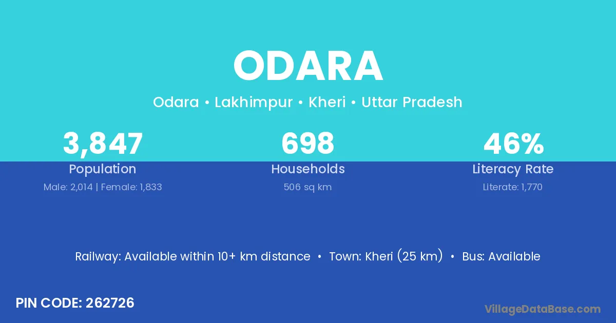 Kheri (35 km) is the nearest town to Odara village for major economic activities and is located approximately 35 km away.