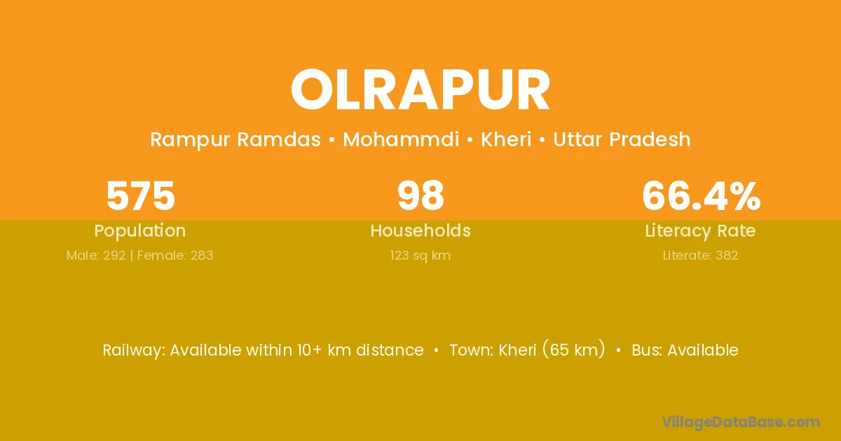 Kheri (65 km) is the nearest town to Olrapur village for major economic activities and is located approximately 65 km away.