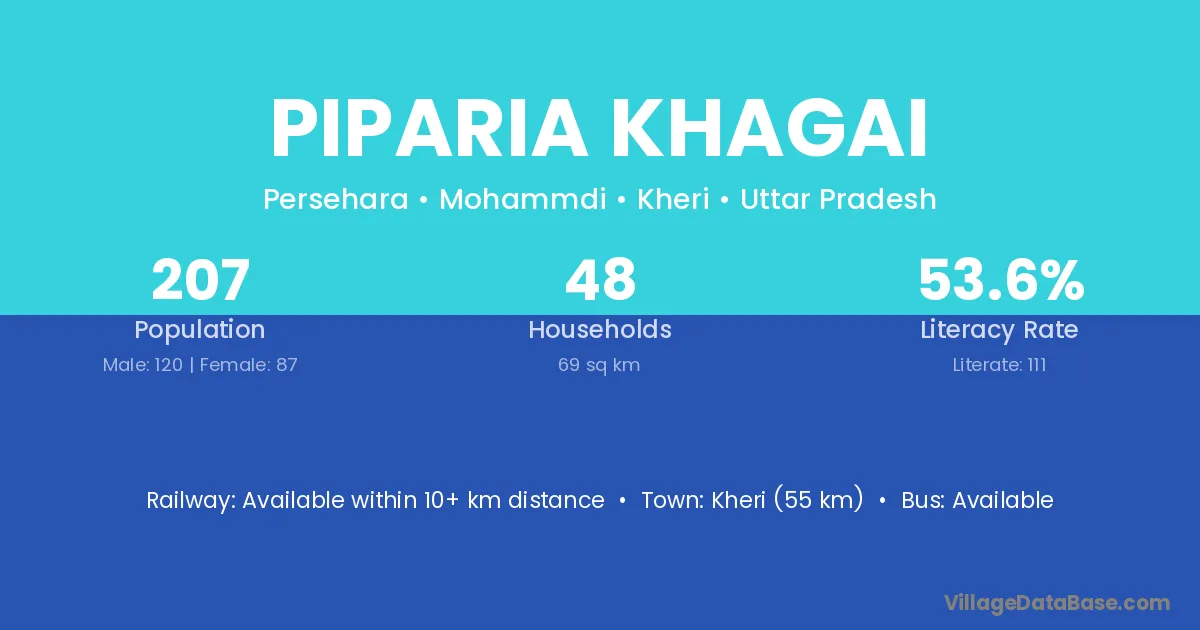 Kheri (55 km) is the nearest town to Piparia Khagai village for major economic activities and is located approximately 55 km away.