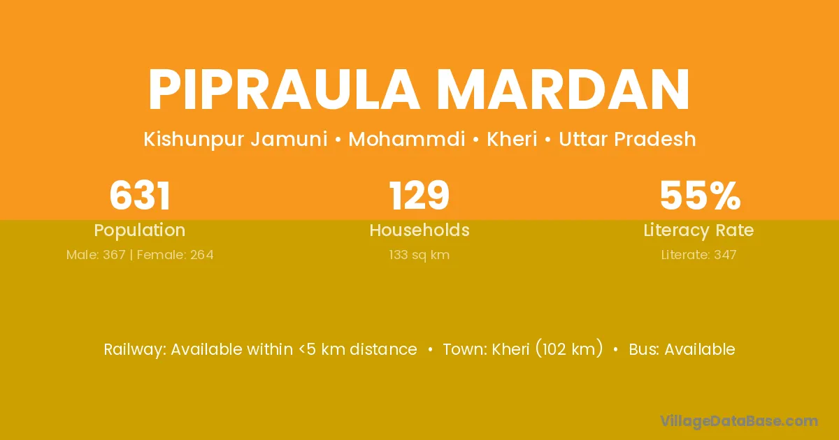 Kheri (102 km) is the nearest town to Pipraula Mardan village for major economic activities and is located approximately 102 km away.