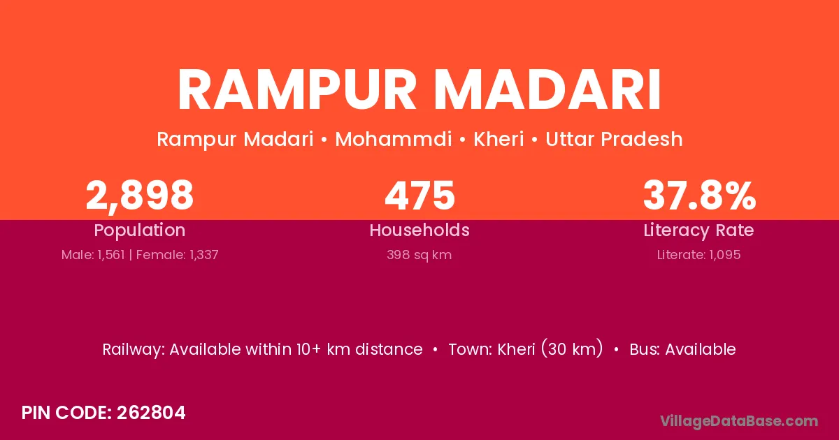Kheri (30 km) is the nearest town to Rampur Madari village for major economic activities and is located approximately 30 km away.