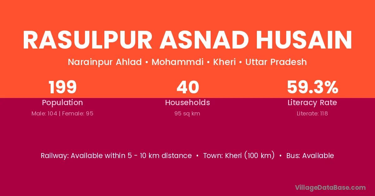 Rasulpur Asnad Husain village has a total population of 199 people, of which 104 are males and 95 are females.