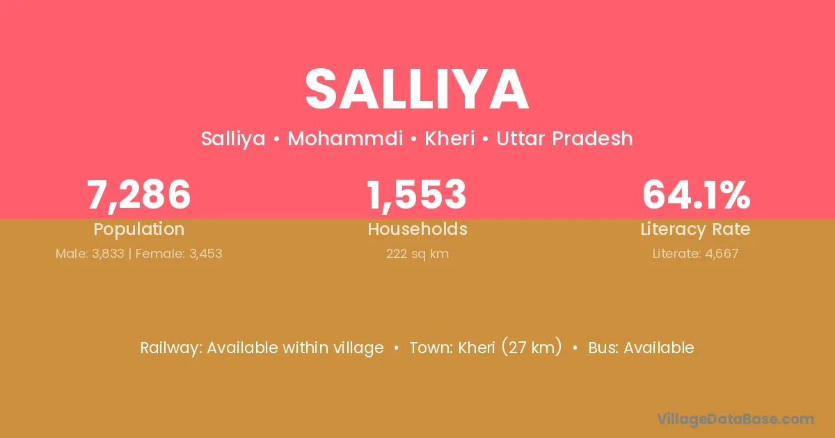 Salliya village has a total population of 7,286 people, of which 3,833 are males and 3,453 are females.