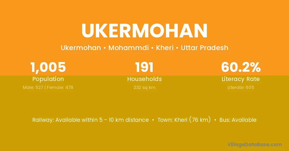 Kheri (76 km) is the nearest town to Ukermohan village for major economic activities and is located approximately 76 km away.