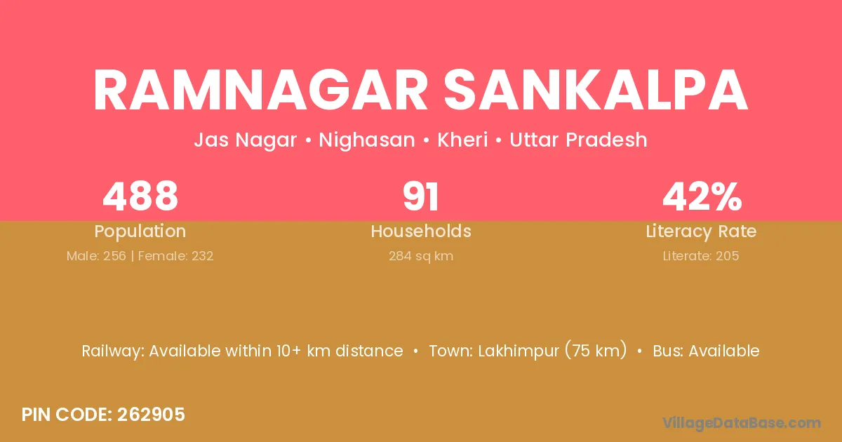 Lakhimpur (75 km) is the nearest town to Ramnagar Sankalpa village for major economic activities and is located approximately 75 km away.