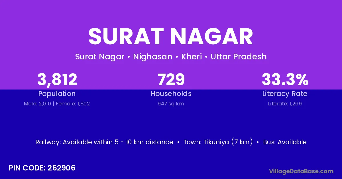 Tikuniya (7 km) is the nearest town to Surat Nagar village for major economic activities and is located approximately 7 km away.
