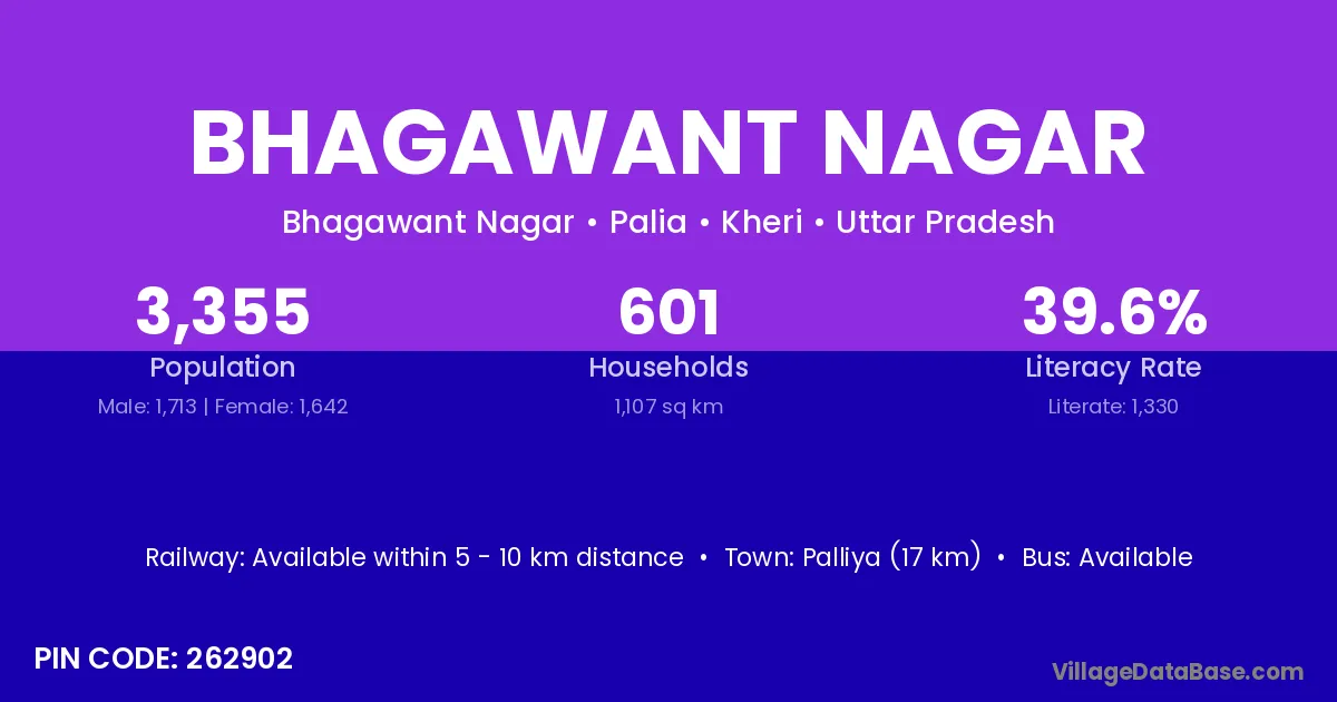 Palliya (17 km) is the nearest town to Bhagawant Nagar village for major economic activities and is located approximately 17 km away.