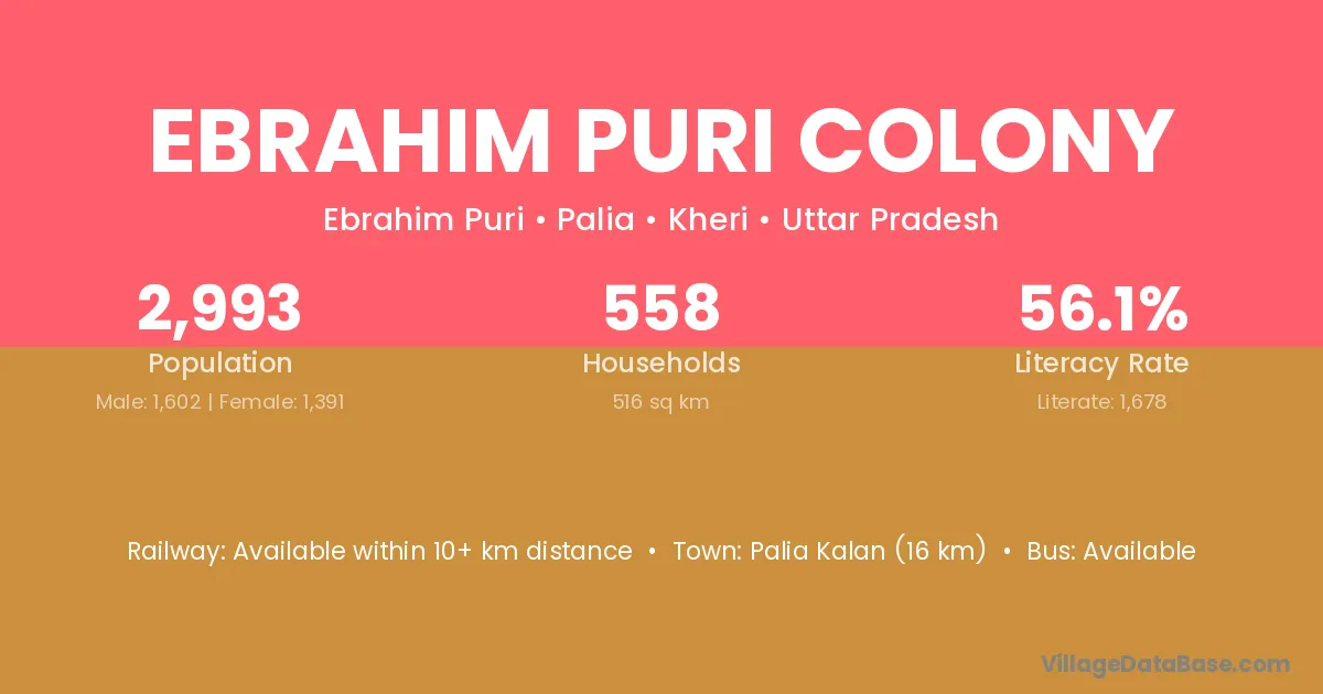 Palia Kalan (16 km) is the nearest town to Ebrahim Puri Colony village for major economic activities and is located approximately 16 km away.